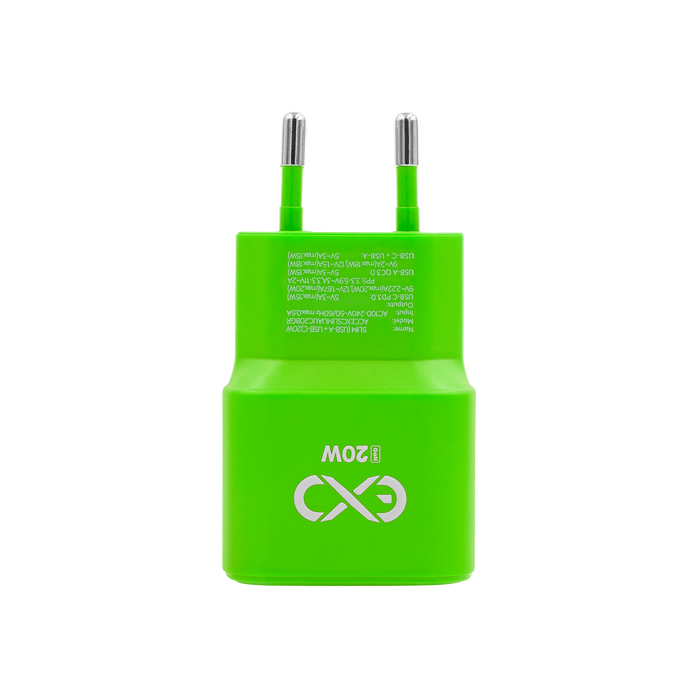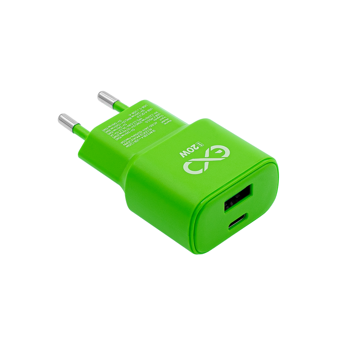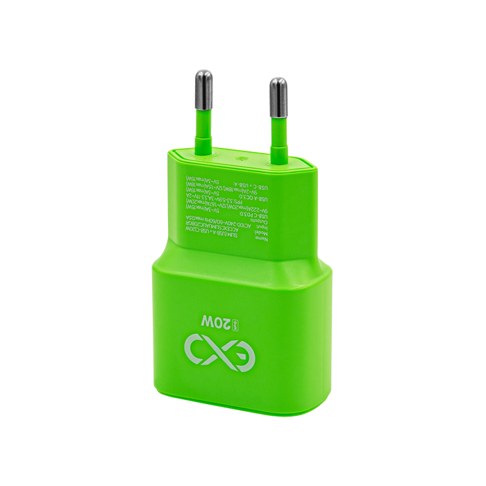 Uniwersalna ładowarka sieciowa eXc SLIM,1xUSBA QC+1xUSBC PD,20W,neonowo zielona