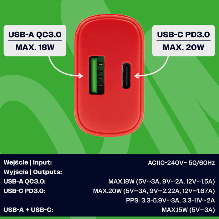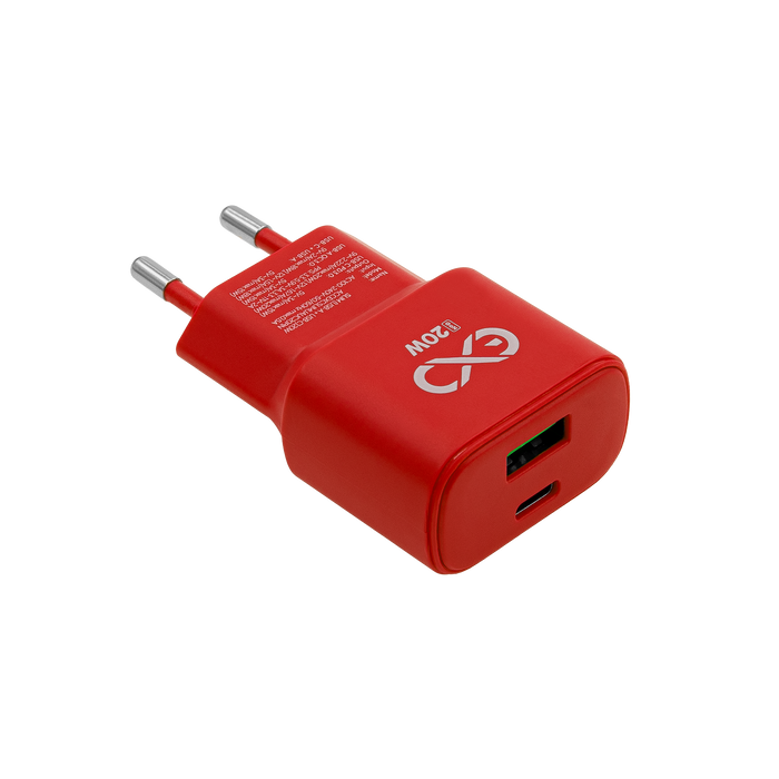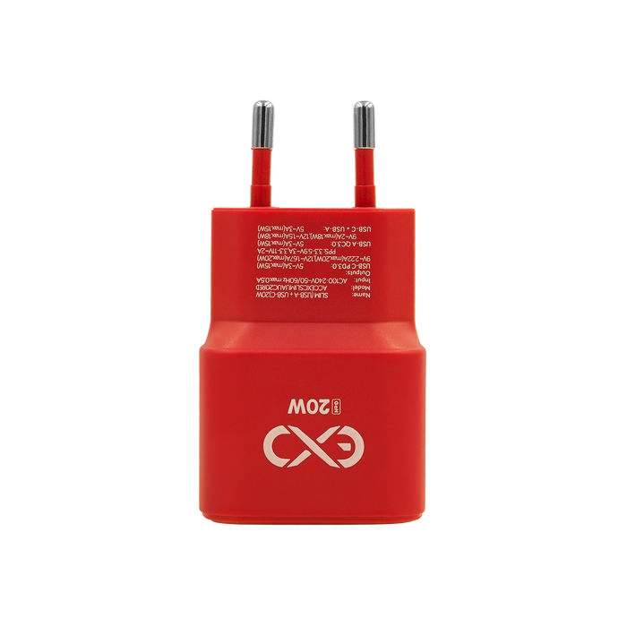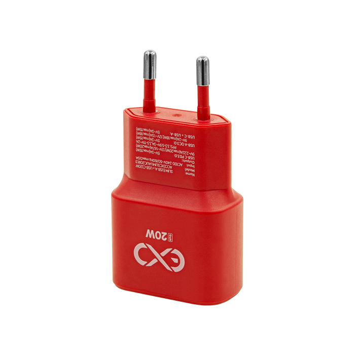 Uniwersalna ładowarka sieciowa eXc SLIM,1xUSBA QC+1xUSBC PD,20W,czerwona