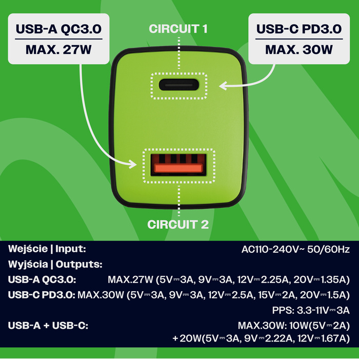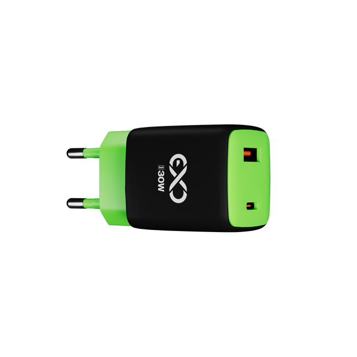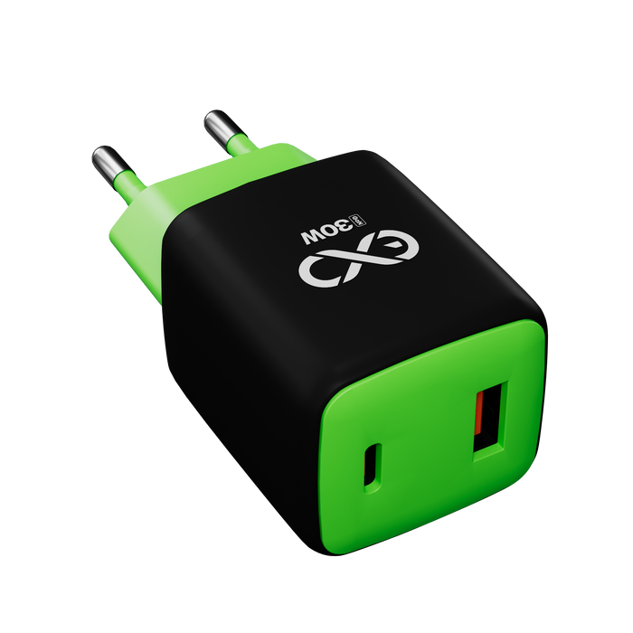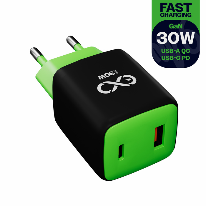 Uniwersalna szybka ładowarka sieciowa eXc CUBE,1xUSBA QC+1xUSBC PD,30W, czarno-neonowo zielona